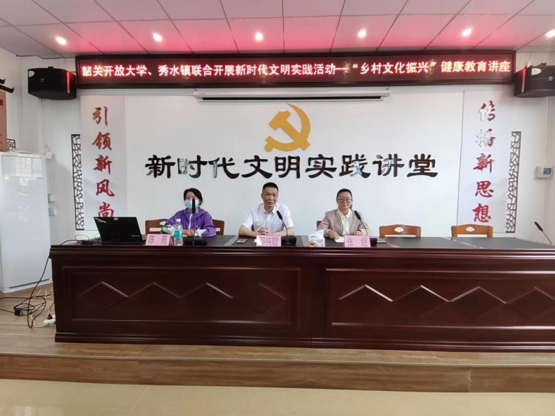 为进一步履行驻镇帮镇扶村工作职责,发挥韶关开放大学社区教育职能优势,普及健康知识,做好疫情防控工作。4月15日上午,韶关开放大学邀请韶关市职业卫生与健康教育所副所长陈苑在秀水镇新时代文明实践中心开展新时代文明实践活动--“乡村文化振兴”健康教育专题讲座,韶关开放大学党委委员、副校长邓纯聪,秀水镇主要领导同志和干部群众约40余人参加了讲座。