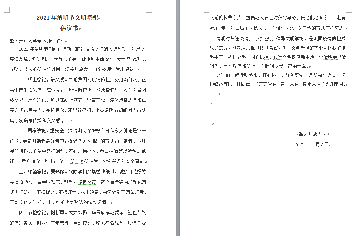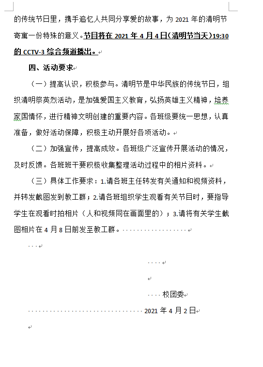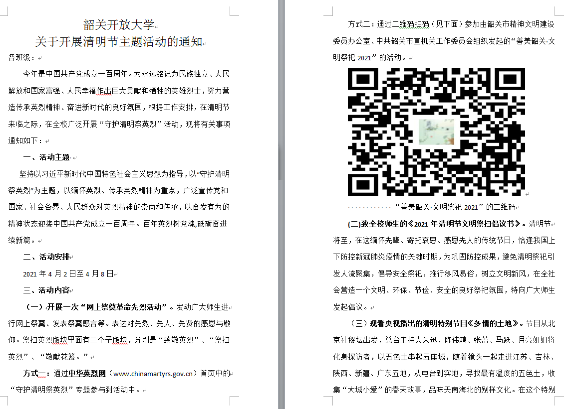一是校团委向全校师生发出《2021年清明节文明祭扫倡议书》,向广大师生在全社会营造一个文明、环保、节俭、安全的良好祭祀氛围;二是开展了一次“网上祭奠革命先烈”网上祭扫活动。发动广大师生通过登陆中华英烈网参加网上祭奠、发表祭奠感言等,表达对先烈、先人、先贤的感恩和敬仰。祭扫英烈共有致敬英烈、祭扫英烈、敬献花篮共三个版块;三是组织广大师生网上观看观看央视播出的清明特别节目《多情的土地》。