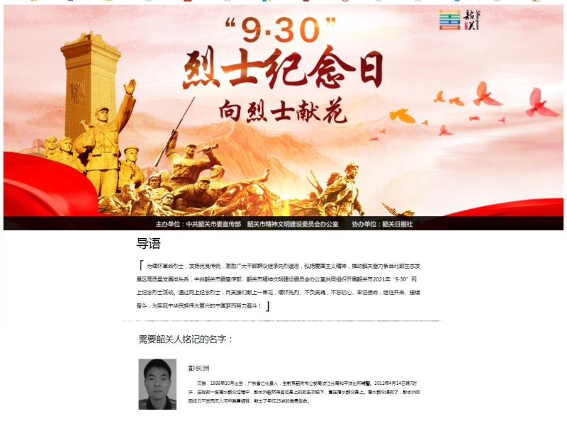 近代以来,为了争取民族独立和人民自由幸福,为了国家繁荣富强,无数的英雄献出了宝贵的生命,革命烈士的精神永垂不朽。为弘扬烈士精神,缅怀烈士功绩,进一步培育和践行社会主义核心价值观,强化理想信念和革命传统教育,激励广大学生继承先烈遗志、弘扬爱国主义精神,根据韶关市委、市政府的工作要求,我校组织开展韶关市2021年“9·30”网上纪念烈士活动。