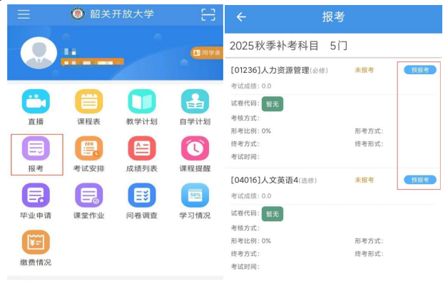 1)登录APP(韶关开放大学在线学习平台)办理补考报名;
